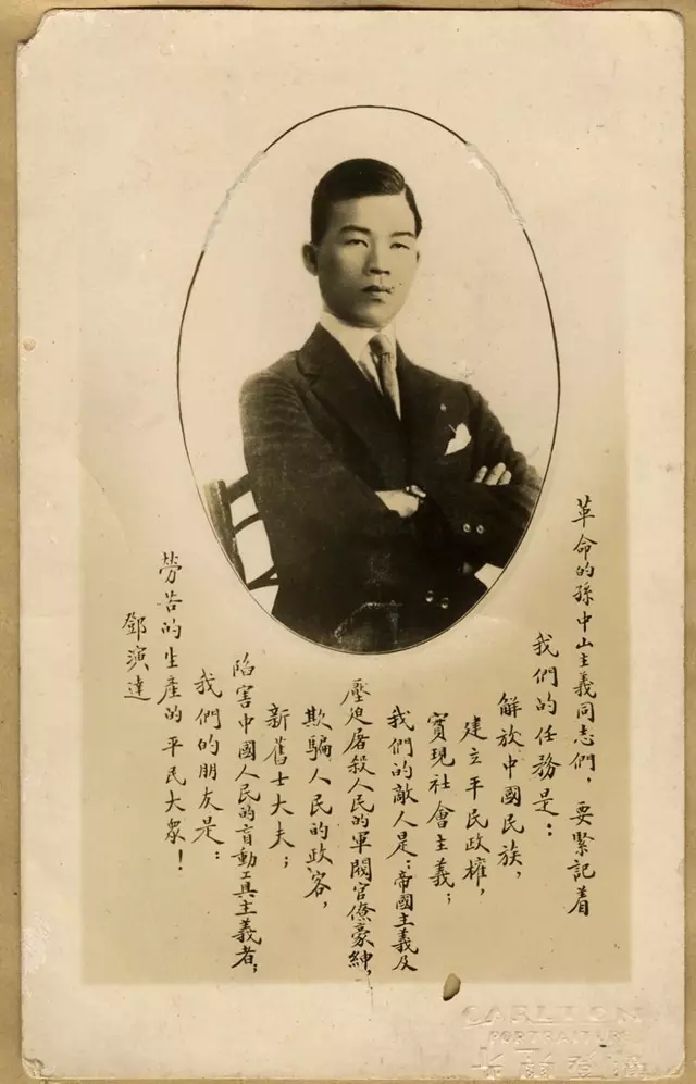 这张照片在彭家珍藏了近80年,照片虽已发黄,但仍清晰可见年轻时期的邓演达英俊威武的形象。照片上还有邓演达的留言:“革命的孙中山主义同志们,要紧记着我们的任务是:解放中国民族,建立平民政权,实现社会主义;我们的敌人是:帝国主义及压迫屠杀人民的军阀官僚豪绅,欺骗人民的政客,新旧士大夫;陷害中国人民的盲动工具主义者;我们的朋友是:劳苦的生产的平民大众!”。落款处还有邓演达的签名。从这句留言不难看出身在海外的邓演达反蒋报国的坚定信念与决心。