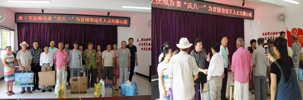 7月28日,在中国人民解放建军90周年来临之际,抚顺市委会在抚顺市望花区建设街道铁岭社区会议室开展了“献出一点爱,点亮微心愿”活动。抚顺市的农工党员们怀揣着敬意与感动为10位贫困退伍军人送去精挑细选的爱心礼物。事前,抚顺市委会通过《抚顺日报》向抚顺市望花区建设街道征集了10位贫困退伍军人的“微心愿”。这些贫困退伍军人中有参加过抗美援朝的志愿老兵,有双腿截肢的伤残军人。当天,抚顺市委会的党员们用爱心为这些饱经风霜的贫困退伍军人点亮“微心愿”。 “这是您想要的‘微心愿’礼物,祝您‘八一’建军节快乐、身体健康!”在送出“微心愿”礼物的同时,农工党员们也将心底真挚的祝福送给每一位贫困退伍军人,为他们提前庆祝“建军节”。